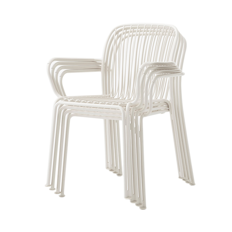 スタッキング可能なサイドチェアのスチールフレームと格子状の座面は、エレガントで用途の広いシリーズのシーンを演出しています。