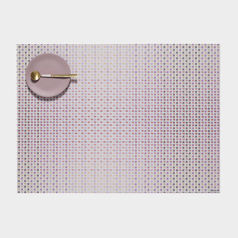 1本の糸に複数の色を使う「バイカラー」を駆使し、柄ごとに糸を開発。2000年に世界で初めて、塩化ビニル素材のプレイスマットを開発し、世界中で大きな反響となり、以降、年2回の新コレクションを発表し、デザイン賞を多数受賞しています。ニューヨークを拠点に活躍するデザイナー Sandy Chilewich(サンディー・チルウィッチ)によるプレイスマット。