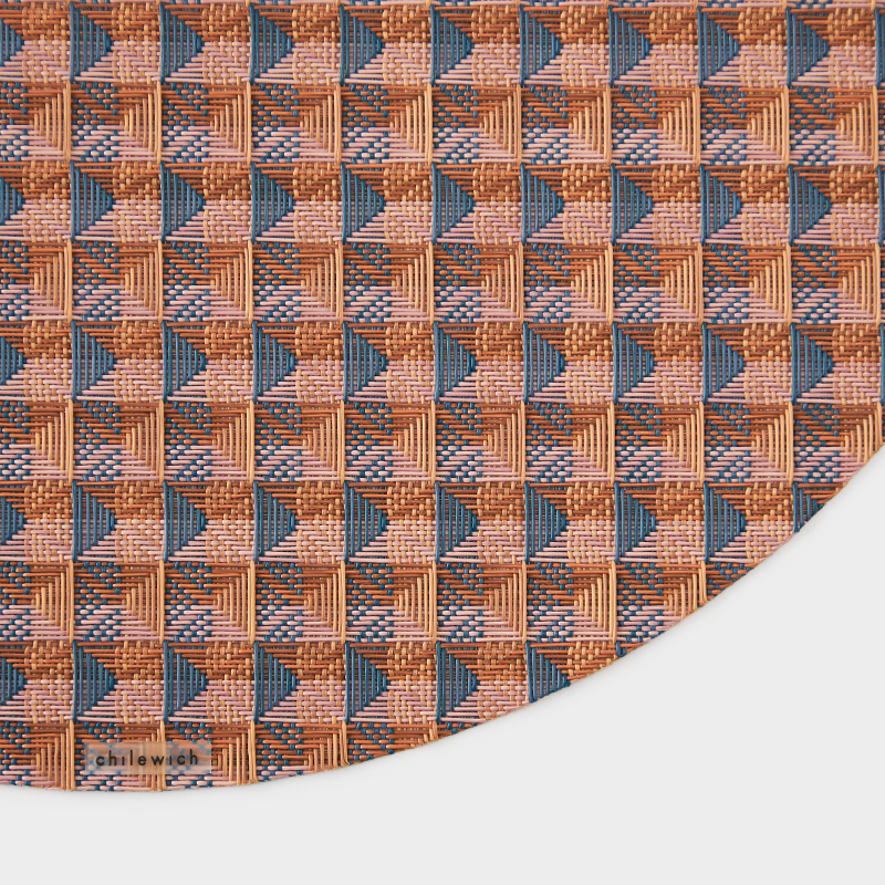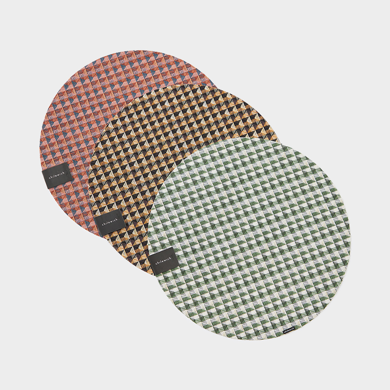 1本の糸に複数の色を使う「バイカラー」を駆使し、柄ごとに糸を開発。2000年に世界で初めて、塩化ビニル素材のプレイスマットを開発し、世界中で大きな反響となり、以降、年2回の新コレクションを発表し、デザイン賞を多数受賞しています。ニューヨークを拠点に活躍するデザイナー Sandy Chilewich(サンディー・チルウィッチ)によるプレイスマット。