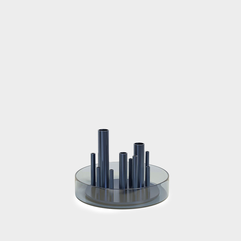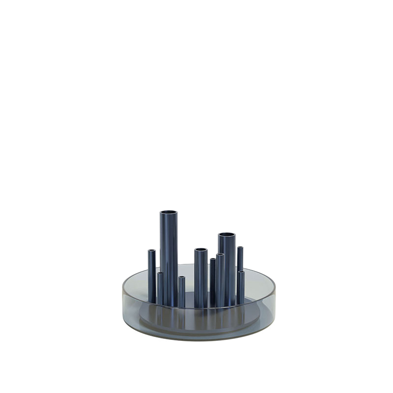 ガラストレイの水が花の鮮度を保ち、金属製の筒が花を一輪ごとに支え、すべての花をあらゆる角度から楽しませてくれます。