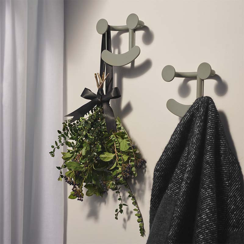 ハッピーフックは、ジャケットや帽子、キッチンエプロンなど、好きなものを掛けられる楽しいデザインのフックです。そのスマイルで室内のムードを明るくし、フックとしての役割を果たします。