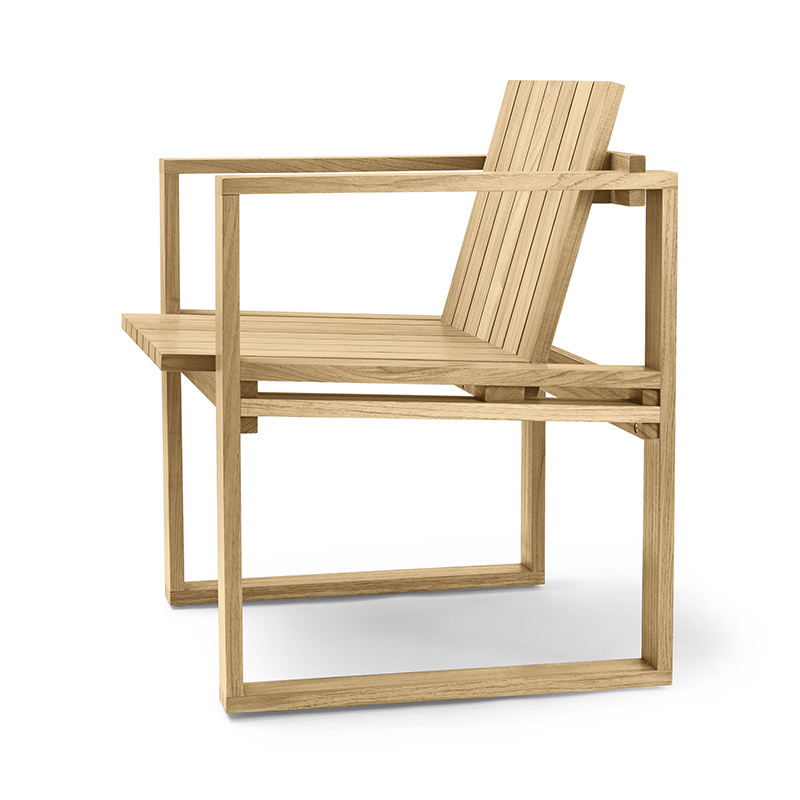 素材には、美しく経年変化する無垢のチーク材を使用。直線的なラインで構築しながらも十分に耐久性を考慮した、キュビズムの影響を受けたデザインです。コンフォートを生み出す、傾斜をつけた座と背、そしてアームレスト、脚、貫きが二つの正方形を構築するように、ほぞ継ぎ加工されており、職人技巧が映える見事なディテールです。