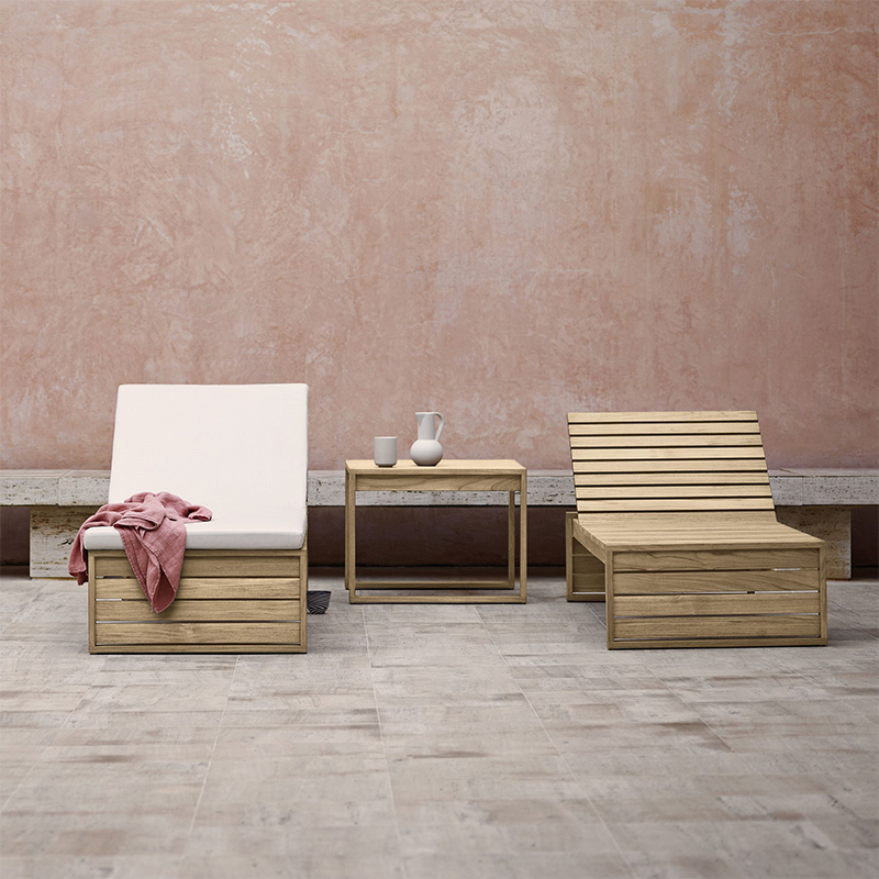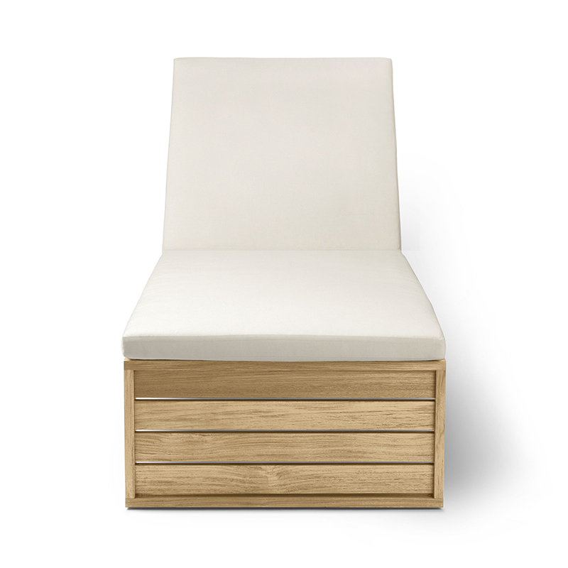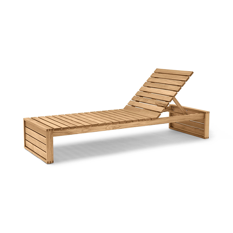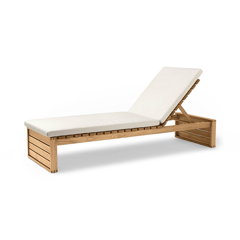 Designer:Bodil KjArデンマークの建築家 ボーディル・ケアが、1959年にデザインしたBK14 サンベッド。屋内外両用の家具として使用できる、耐久性を考慮したIndoor-Outdoorシリーズとしてデザインされました。横になりくつろぐという機能ばかりでなく、外観の美しさにも目を奪われるサンベッド。シリーズを構成する他の家具と同様、素材は耐候性と経年変化を考慮した無垢のチーク材。幾何学的と言える直線的な構造が特徴となっています。オプションで用意された耐候性のファブリックSunbrellaを使用したクッションが、優雅でより豊かなくつろぎをお約束します。