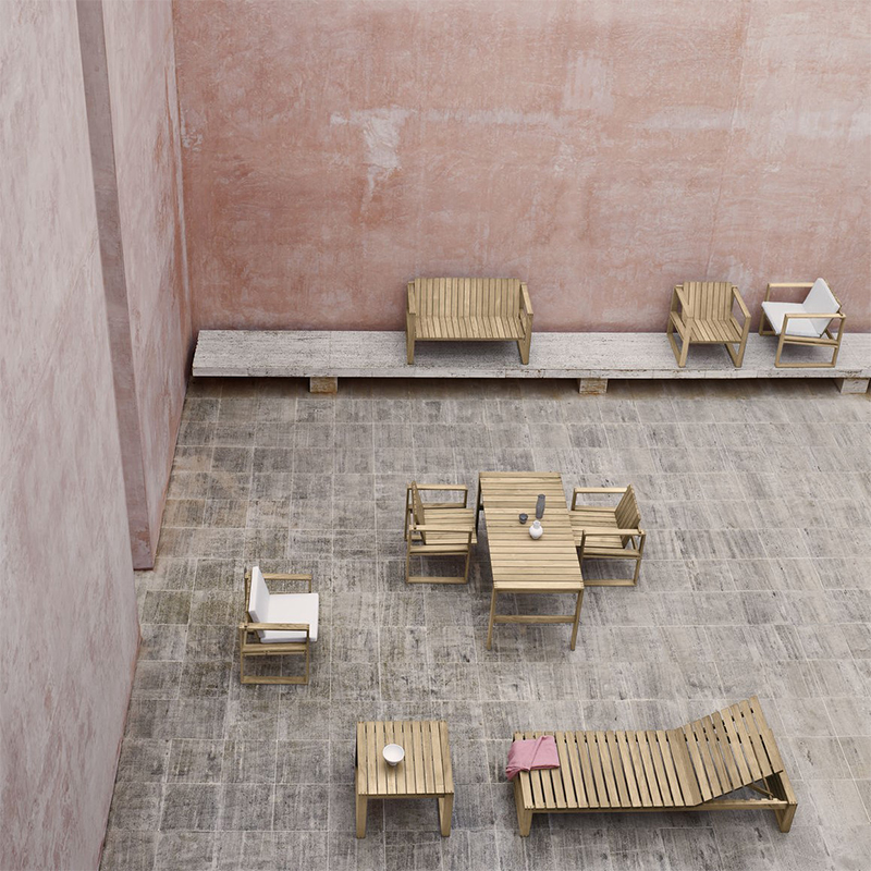 デンマークの建築家 ボーディル・ケアが、1959年にデザインしたBK14 サンベッド。屋内外両用の家具として使用できる、耐久性を考慮したIndoor-Outdoorシリーズとしてデザインされました。横になりくつろぐという機能ばかりでなく、外観の美しさにも目を奪われるサンベッド。シリーズを構成する他の家具と同様、素材は耐候性と経年変化を考慮した無垢のチーク材。幾何学的と言える直線的な構造が特徴となっています。オプションで用意された耐候性のファブリックSunbrellaを使用したクッションが、優雅でより豊かなくつろぎをお約束します。