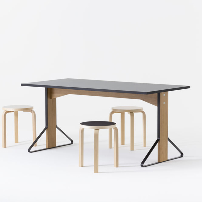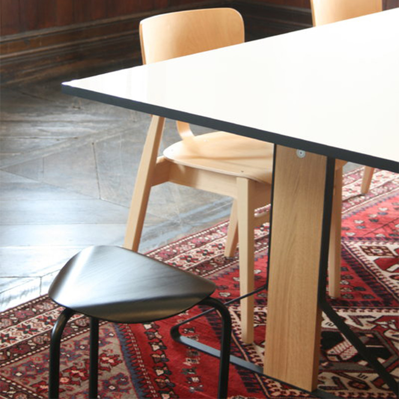 ”縦方向”の支えとなる頑丈な木製部分と、”斜め方向”の支えとなるスチール部分。異なる素材の組み合わせが特徴的なテーブルは、耐久性はもちろんのこと、全体のデザインにリズムをもたらし、独自のシルエットを形作っています。