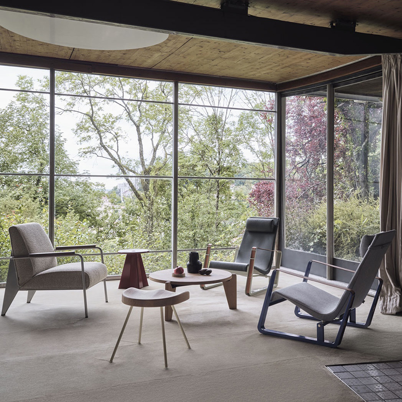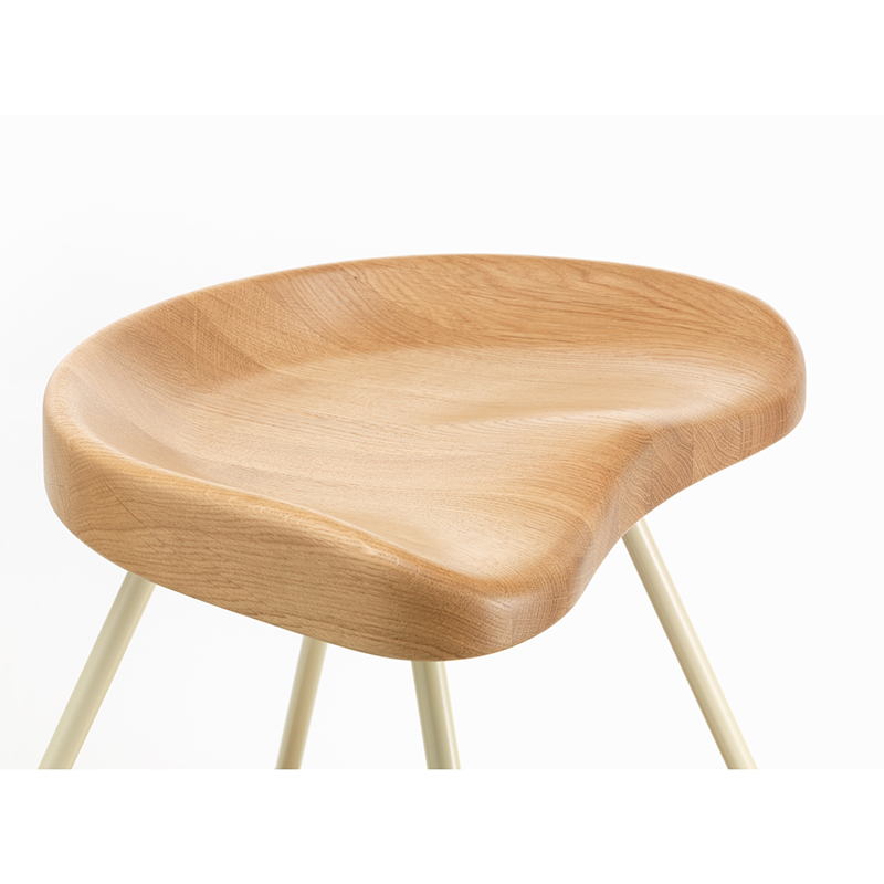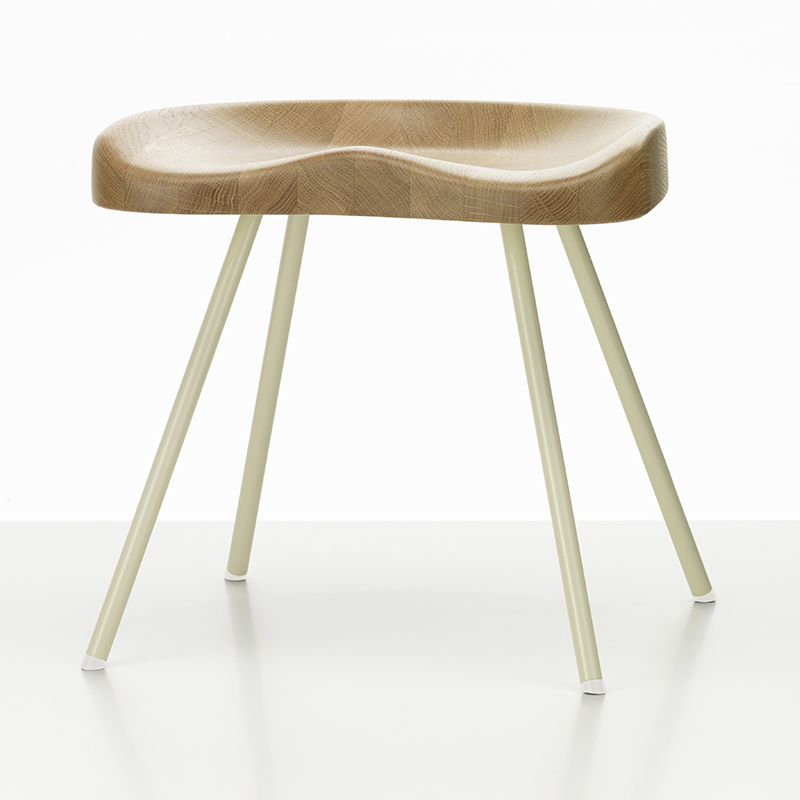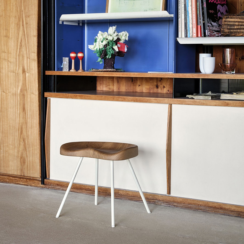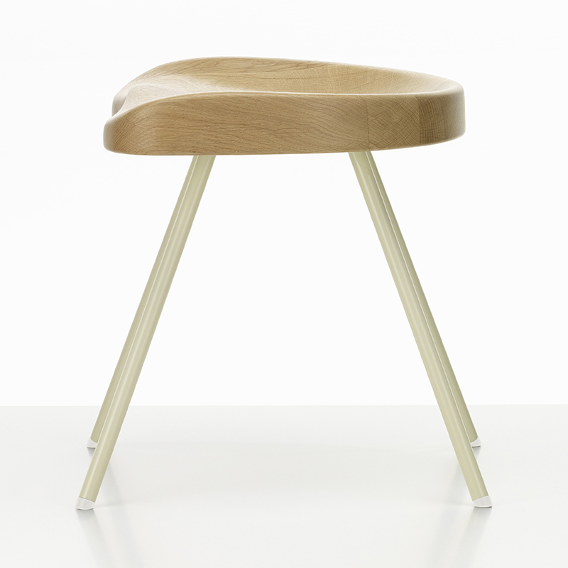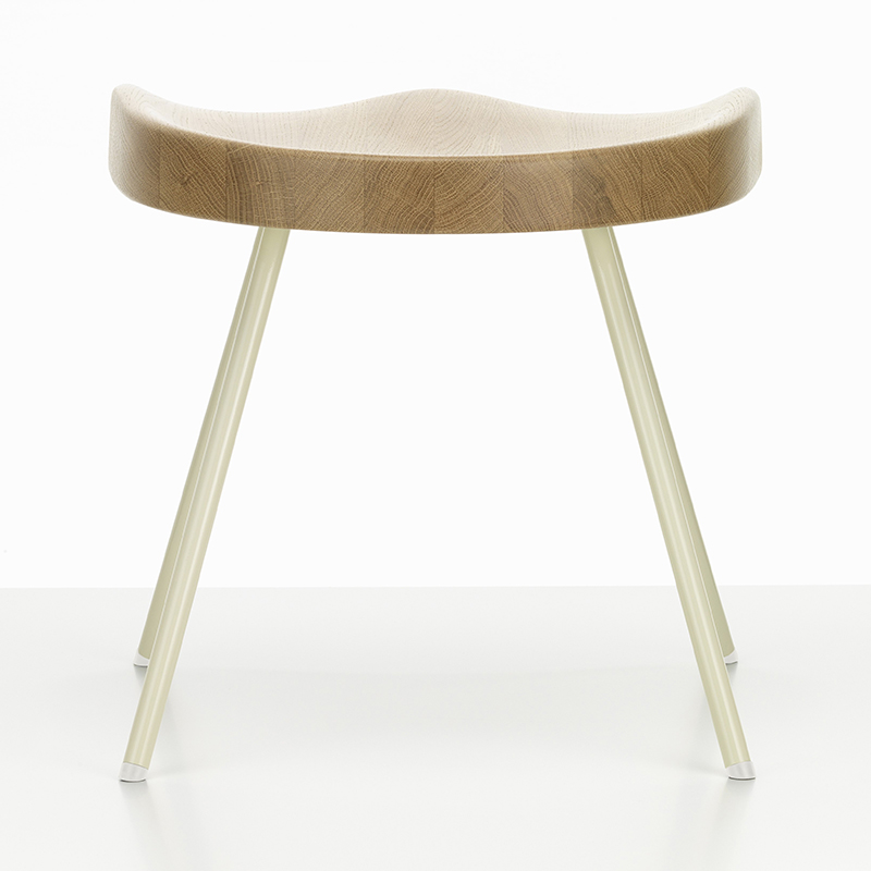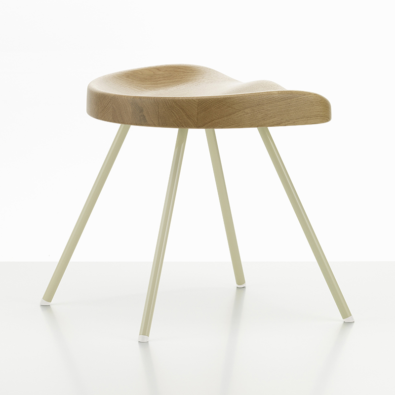 ジャン・プルーヴェによってデザインされたスツール「タブレ N°307」は、中心部に窪みを持たせた、まるでトラクターのサドルのような座面が特徴です。