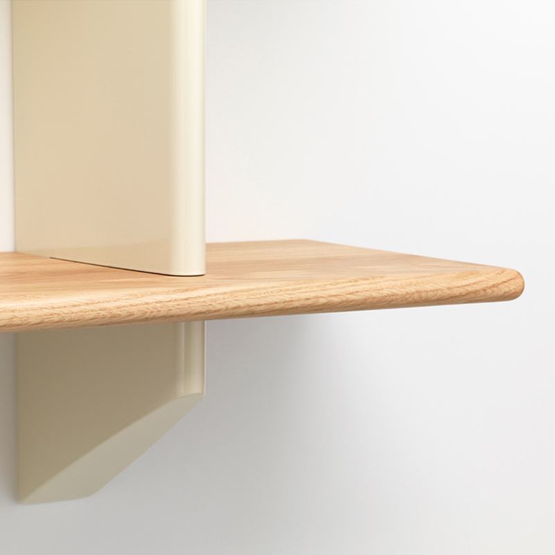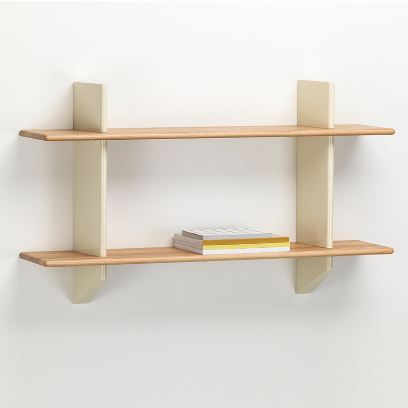 金属製ブラケットには切り込みが施され、無垢材による棚板が水平に挿入されています。対照的な素材のコンビネーションが美しいデザインは、彫刻的でありながらも実用性を兼ね備えています。