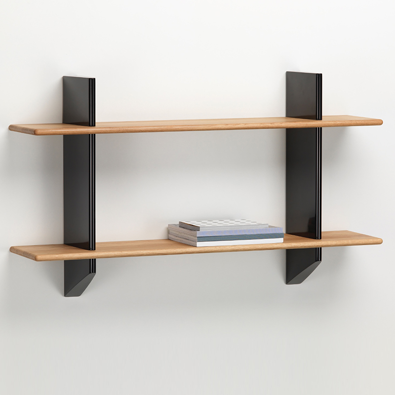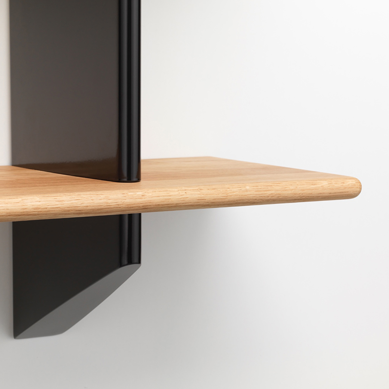 金属製ブラケットには切り込みが施され、無垢材による棚板が水平に挿入されています。