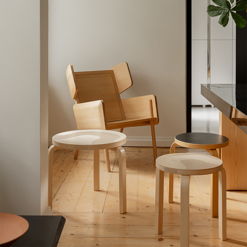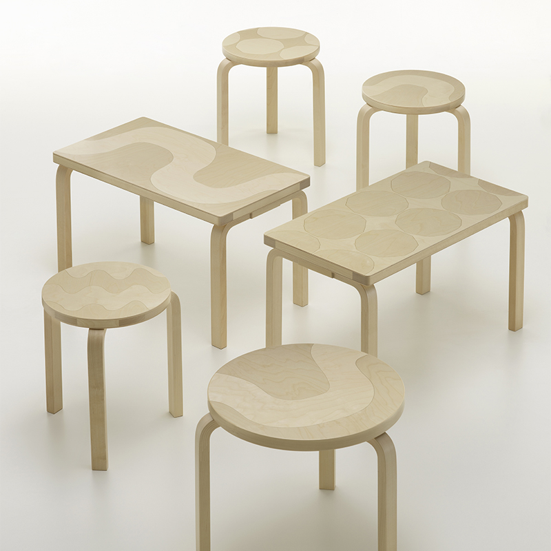 マリメッコのプリント作りのアートと、アルテックの曲げ木技術を融合させたこのシリーズは、両ブランドに共通する「建築」「自然」「人間中心の実用主義」を讃える特別なコレクションです。