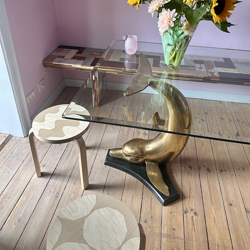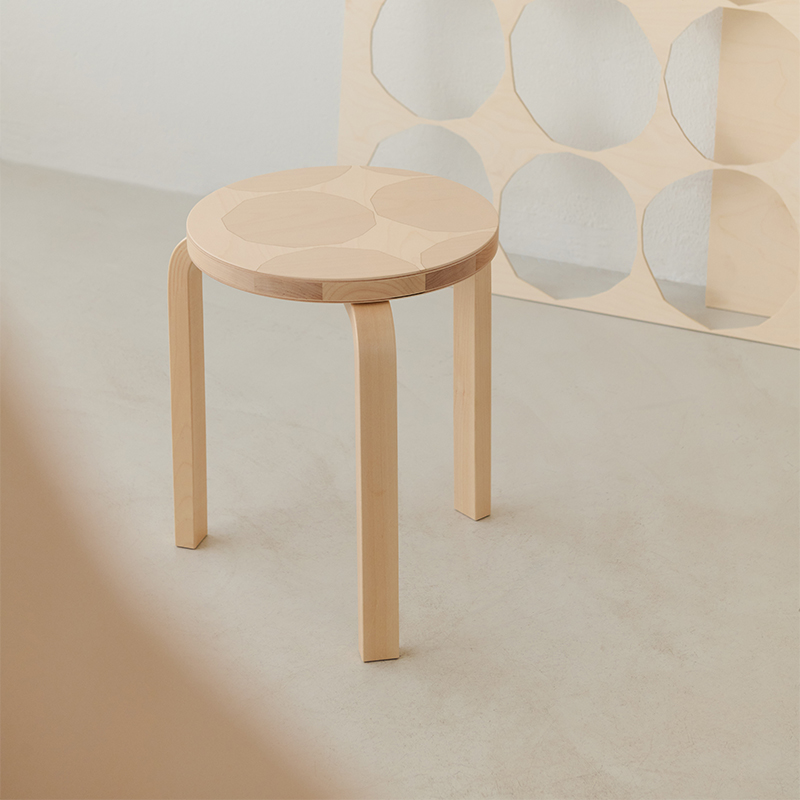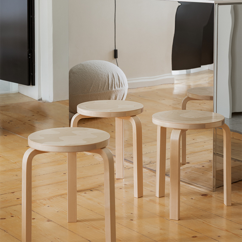 「マリメッコ」のデザイナー、マイヤ・イソラによる象徴的なパターンと、アルヴァ・アアルトが手掛けた「スツール60」が出会い、美しく溶け合います。
