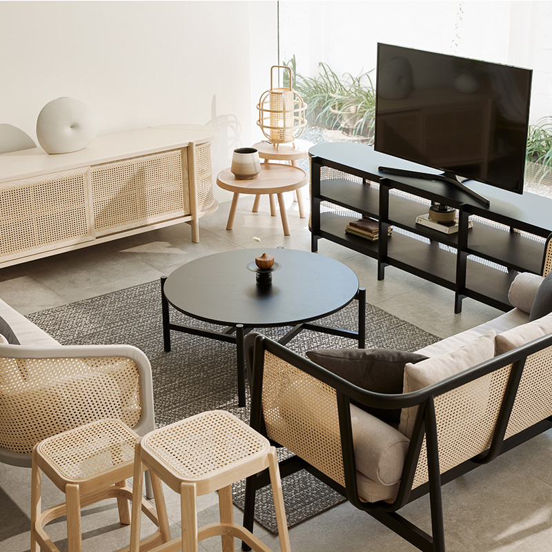 「イースト・ミーツ・ウエスト」をテーマにしたCANEコレクションは、タイの木工会社で長い歴史と専門知識を持つPODIUM工場で製造されています。
