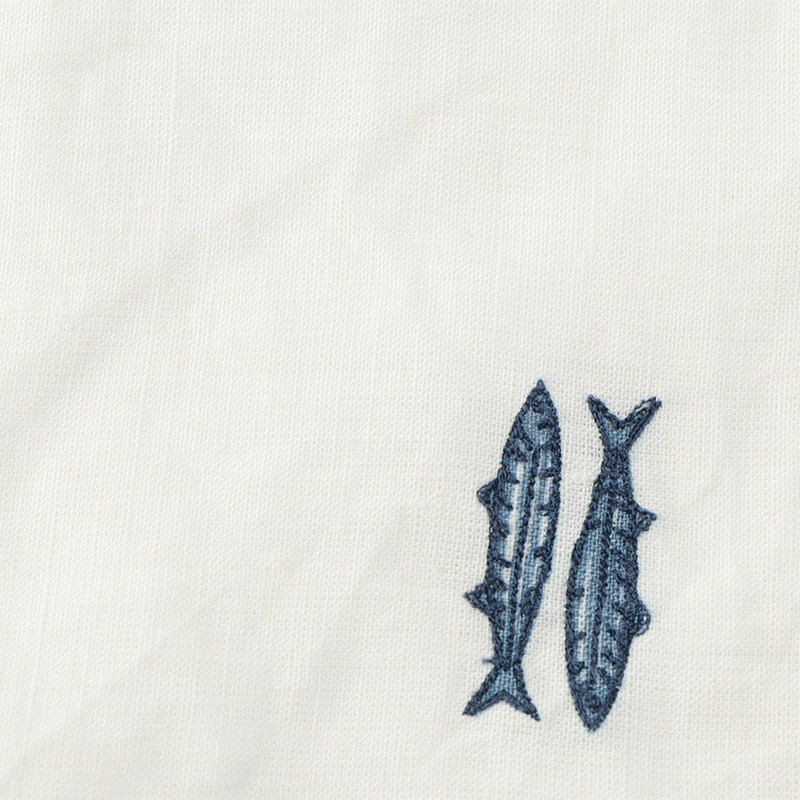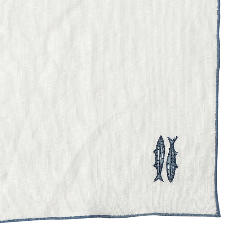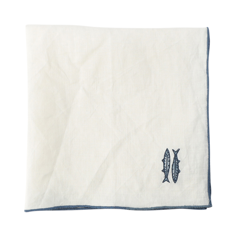 イワシのモチーフが刺繍されたリネン100%のナプキンは、柔らかさと耐久性を兼ね備えており、カジュアルな食事にもおもてなしのディナーにもぴったりです。