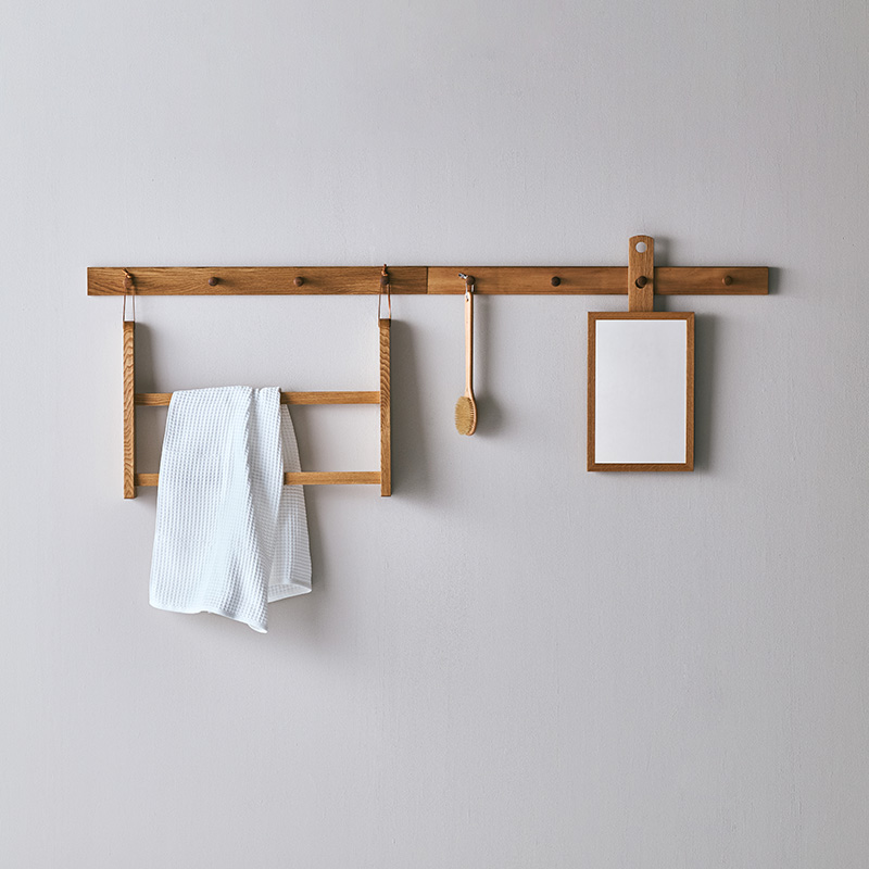 アン シェーカーペグレールは、同シリーズのハンギング製品や衣類を簡単に掛けられる、シンプルで機能的なレールです。