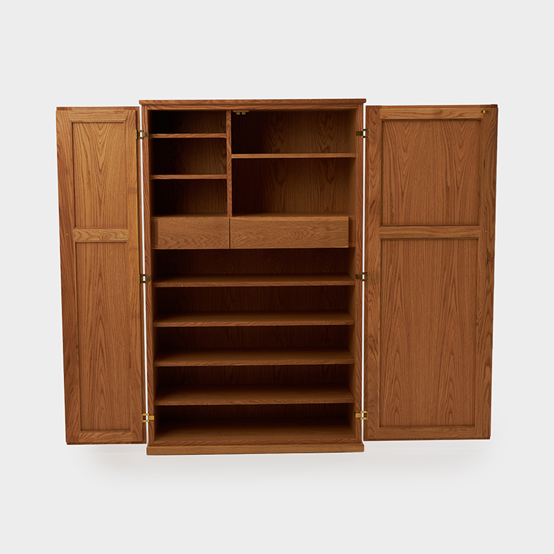 アン シェーカーキャビネットは、扉から背面まで同じ素材の木材で覆われ、どの角度から見ても美しい佇まいが特徴です。