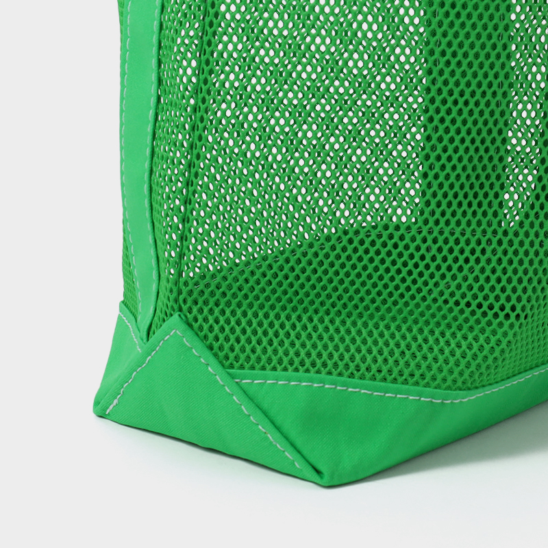 メッシュ素材を使ったバゲットトート。 持ち手を手前に付けているため、 バゲットなどの長い物を入れても肩に掛けやすい作りが特長です。 16インチのPCがぴったり入るサイズ。