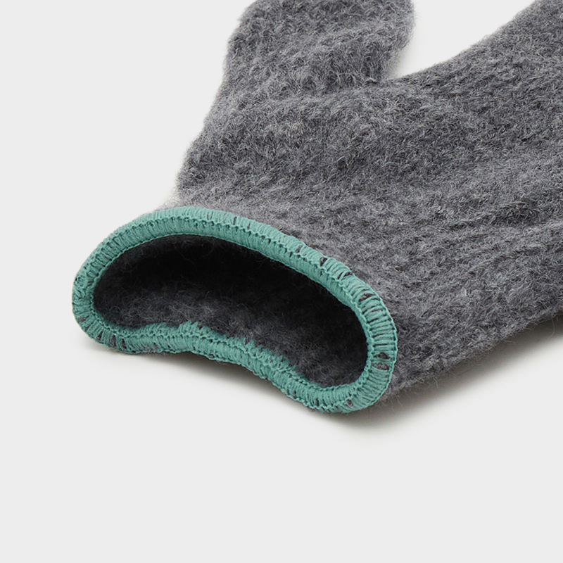 通常の軍手と同じ工程で製作され、左右対称でパターンやステッチも同様ですが、仕上げは手作業で行い、細部に丁寧な手仕事が施されています。