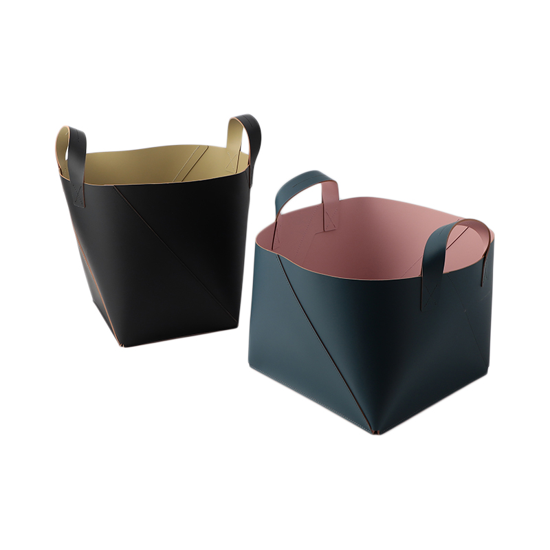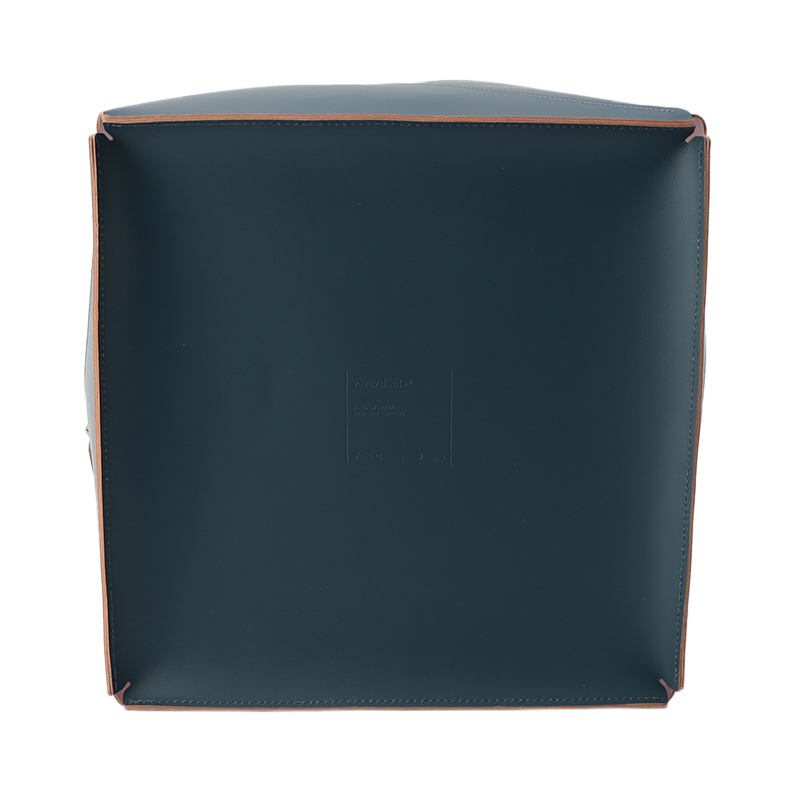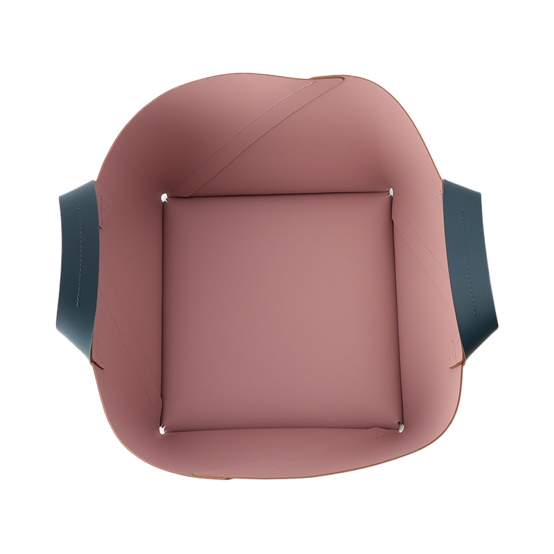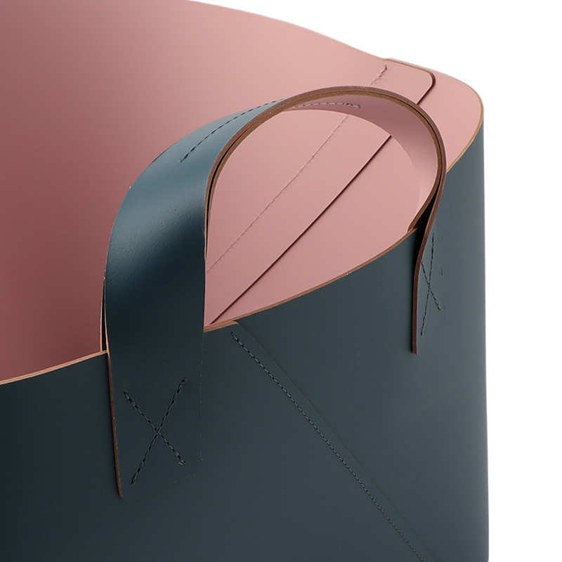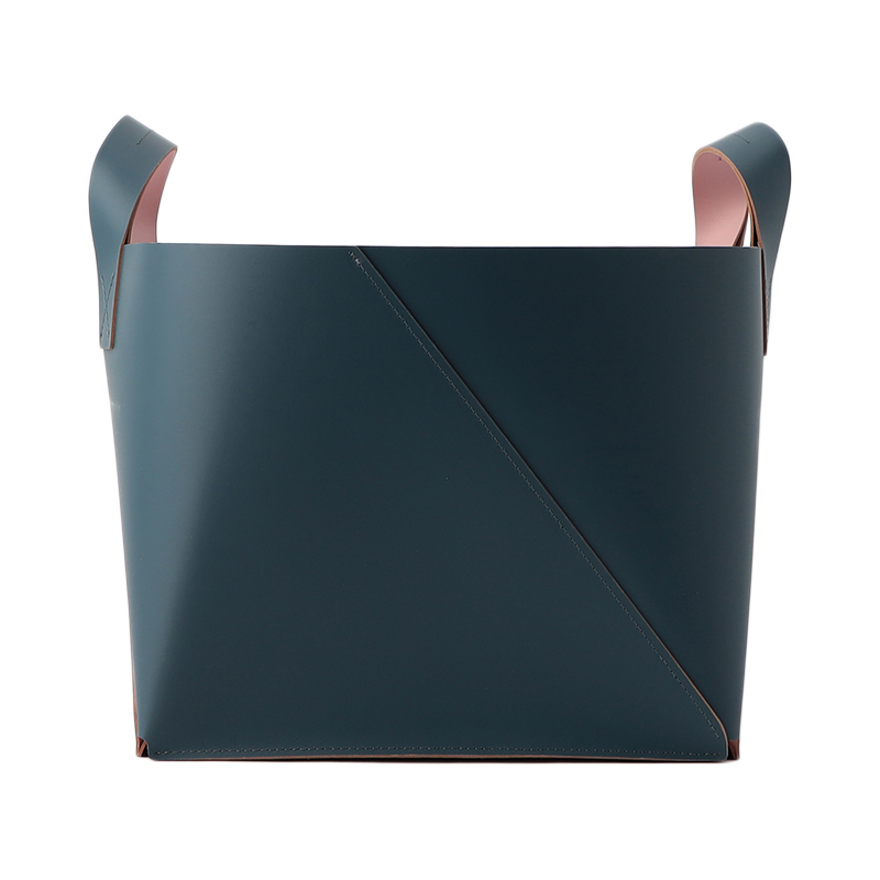 正方形のフォルムは、衣類、子供のおもちゃ、毛布など、日常の必需品をたっぷり収納できます。両側には持ち運びに便利なハンドルが付いており、家の中での移動も簡単です。シックなペトロール色の外観に、柔らかいピンク色の内側を組み合わせたツートンカラーが特徴です。