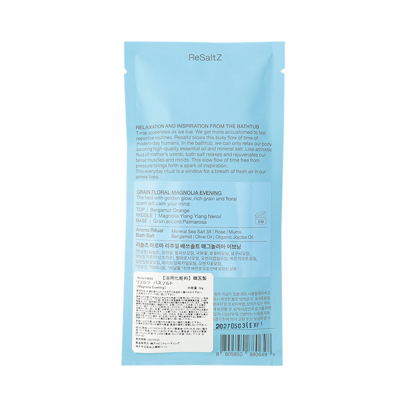 ReSaltZとは、Re(回復)、Salt(生命の礎)、Z(未知数)を意味する言葉で、体にやさしい自然素材を通じて、体本来の回復を表現し、バランスの取れた生活と健康的な美を支えるプロダクトを提案しています。ミネラル成分が豊富な韓国・全羅南道の飛禽島(ピグムド)の天日塩をベースに、天然アロマオイル、肌の保湿力を高める栄養成分を多く含んだエッセンシャルオイル、お肌に優しいハーブが豊富に含まれたウェルネスバスソルト。