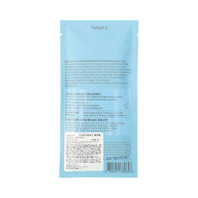 ReSaltZとは、Re(回復)、Salt(生命の礎)、Z(未知数)を意味する言葉で、体にやさしい自然素材を通じて、体本来の回復を表現し、バランスの取れた生活と健康的な美を支えるプロダクトを提案しています。ミネラル成分が豊富な韓国・全羅南道の飛禽島(ピグムド)の天日塩をベースに、天然アロマオイル、肌の保湿力を高める栄養成分を多く含んだエッセンシャルオイル、お肌に優しいハーブが豊富に含まれたウェルネスバスソルト。