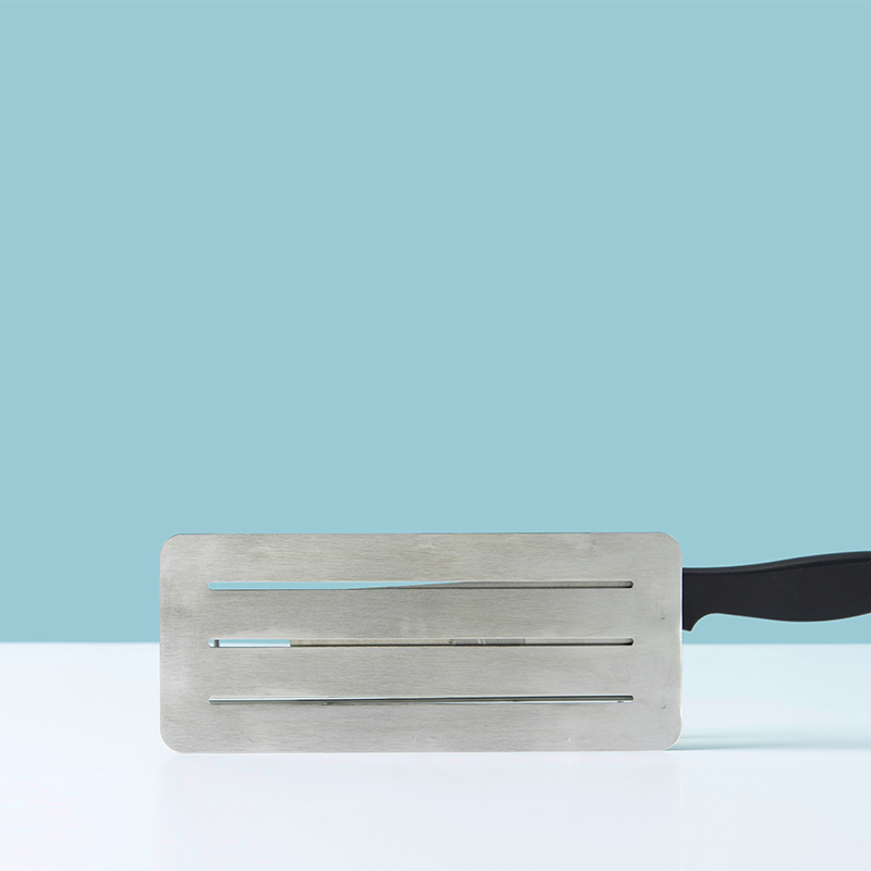 テコの原理で包丁の柄の重みを利用して、刃を浮かせる構造。包丁の刃に直接ステンレスが当たるのを防ぎます。