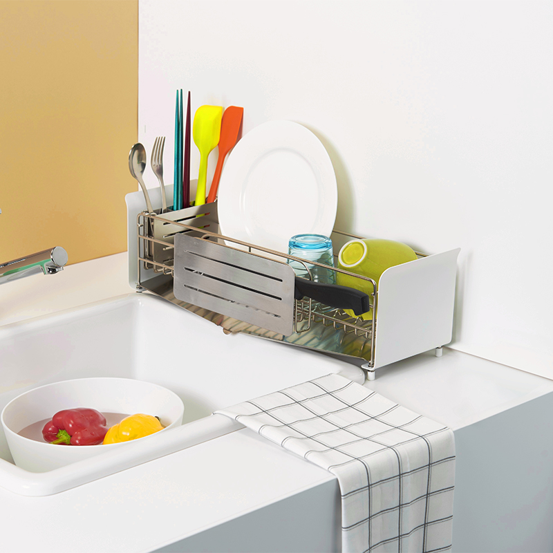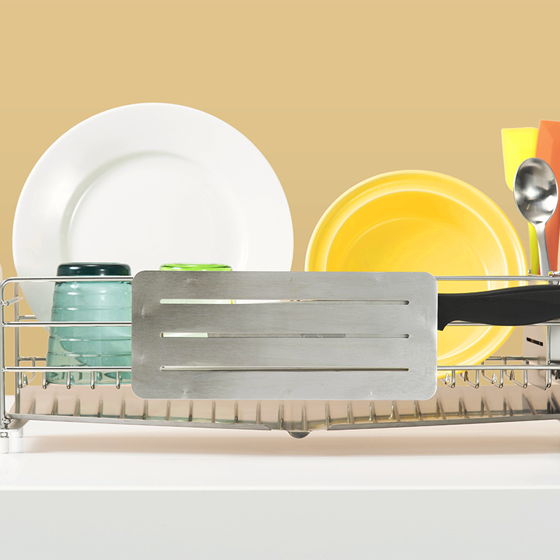 そのまま置いて使うだけでなく、背面のフックでUtaUの水切りラックにピタッと設置できます。厚さ2cmまでのまな板に対応。横から見てもスリム設計なので、スペースの少ないキッチンでも場所を取らずにスッキリ収納できます。