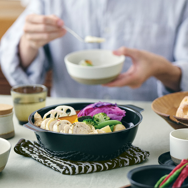 調理する人も食べる人も一緒に美味しい時間をシェアできるKAKOMI IH琺瑯鍋は、季節を感じながらいただく料理や、テーブルを囲んで穏やかなひとときを楽しむのにぴったりの調理道具です。