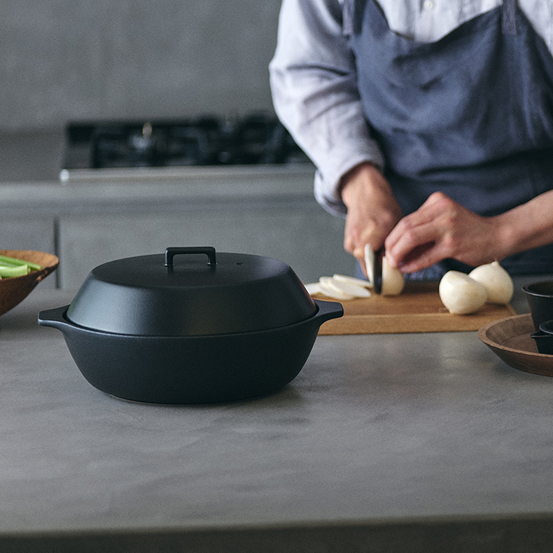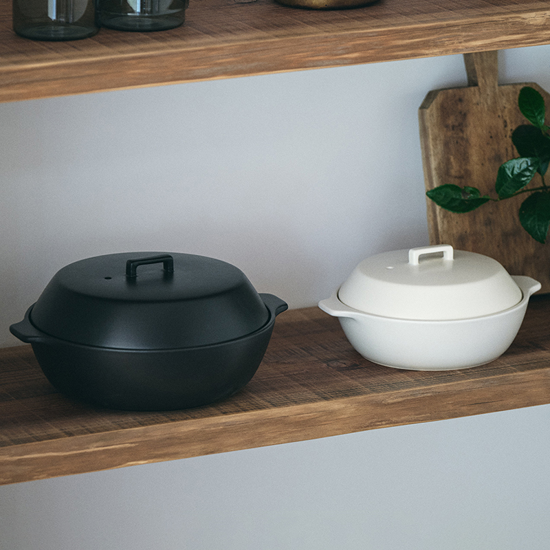 ガスレンジでの直火調理はもちろん、電子レンジ、オーブンで使える耐熱陶器製のかこみ鍋。