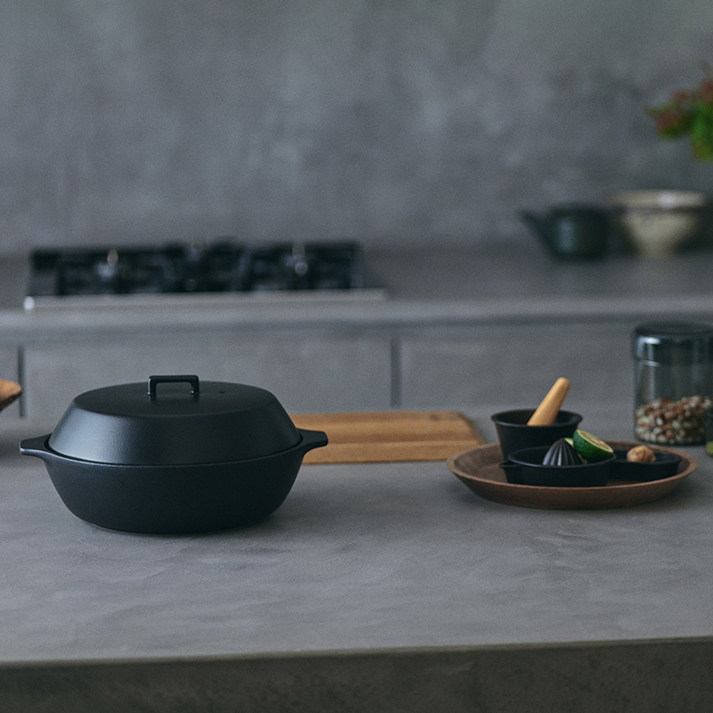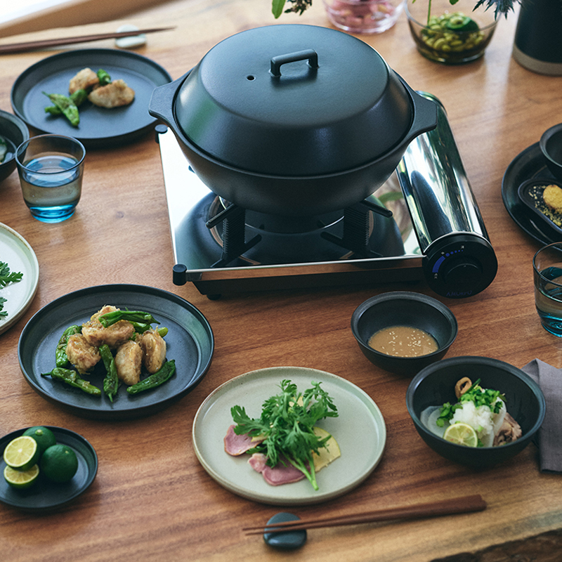 テーブルに並んだ器とも調和する佇まいです。一般的な陶器に比べて丈夫で割れにくく、軽くて扱いやすい土鍋です。
