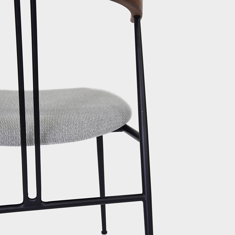 GamFratesiが得意とする職人技、創造性、素材理解が細部のデザインに表現されています。背もたれから座面に伸びる2本のラインは、楽器のヴァイオリンの並行弦を連想させます。