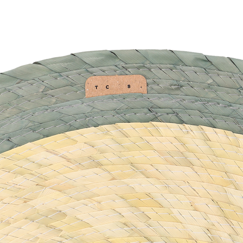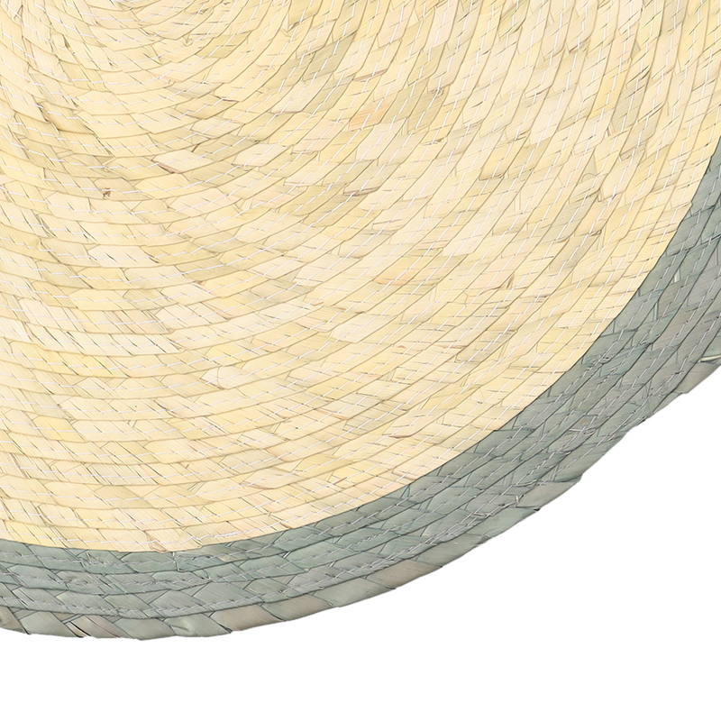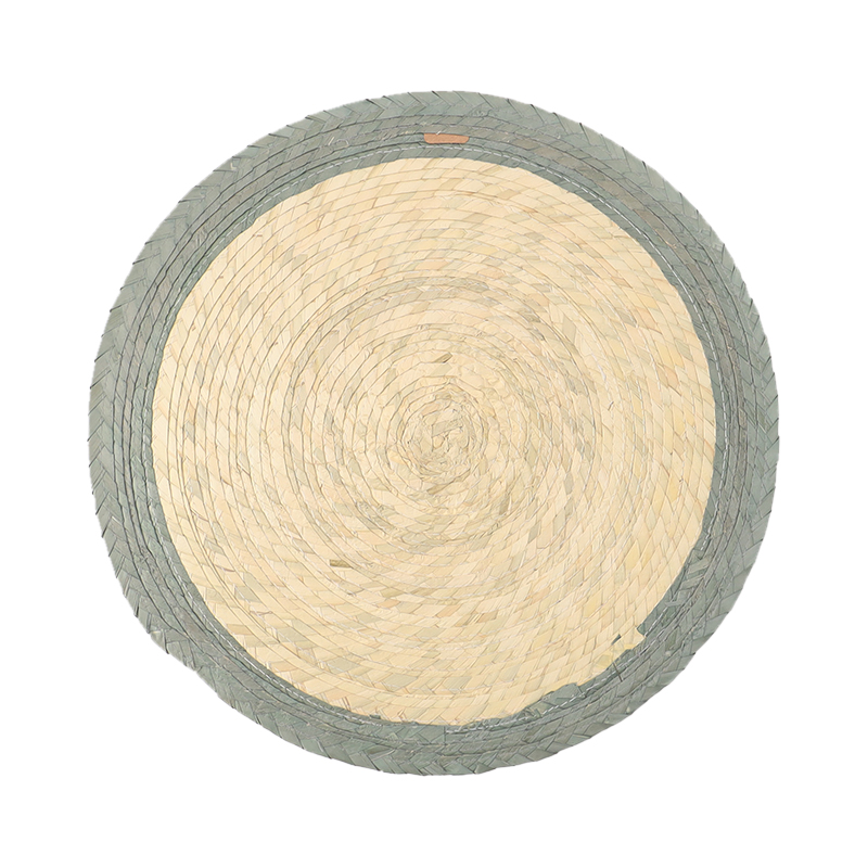 ヤシの木の葉を使用し、ハンドメイドで作られたプレイスマットは、ベースのナチュラルカラーにアプリコット、ブルー、セージ、レンガ色など、大地や植物、海などの大自然を思わせるカラーを組み合わせて作られました。