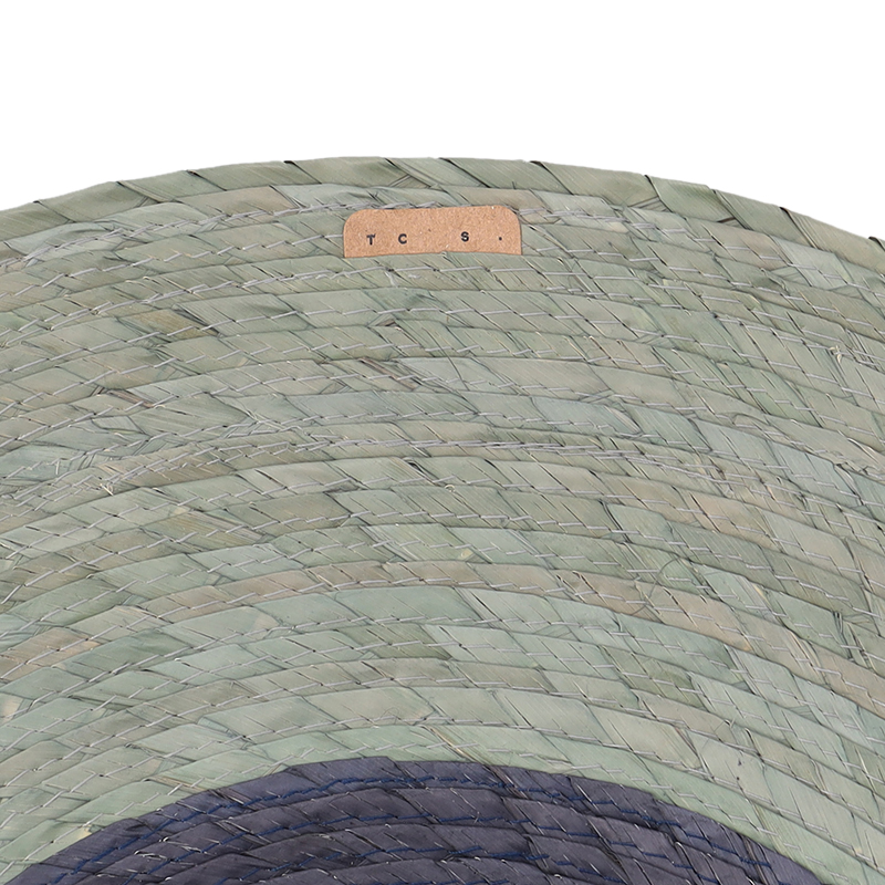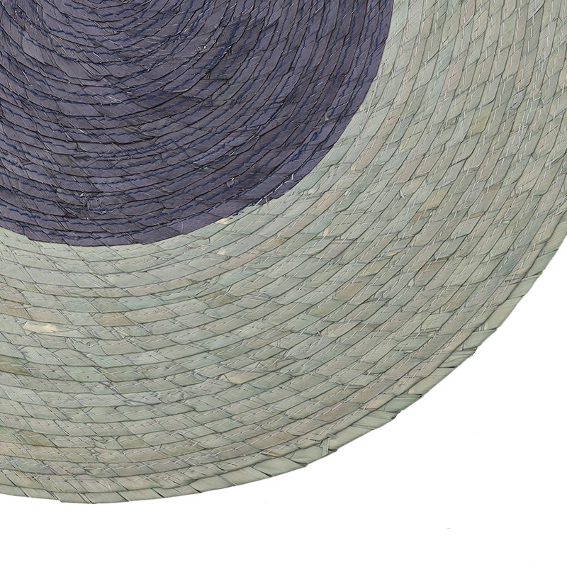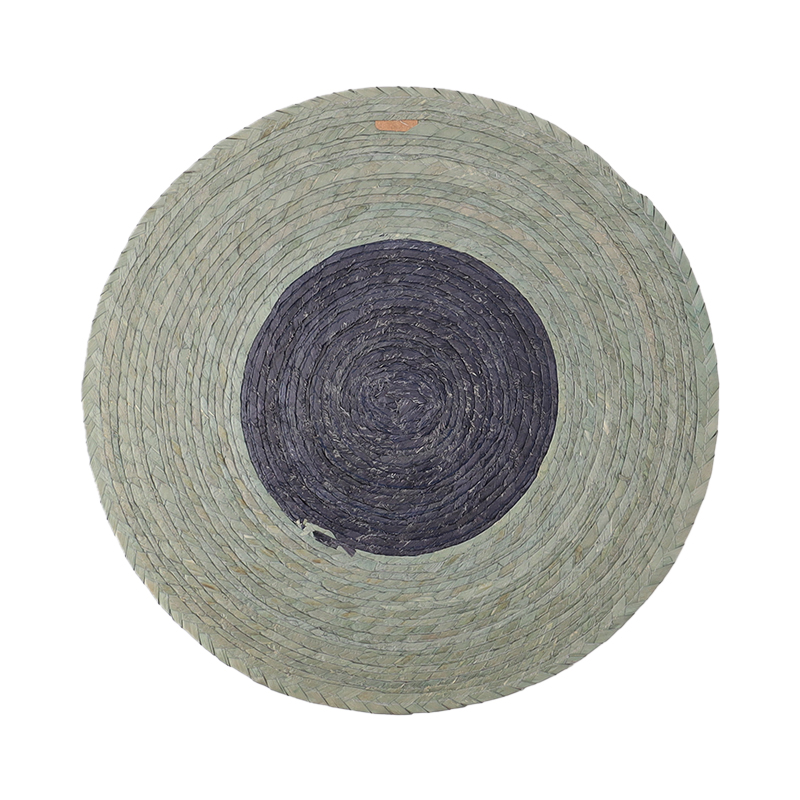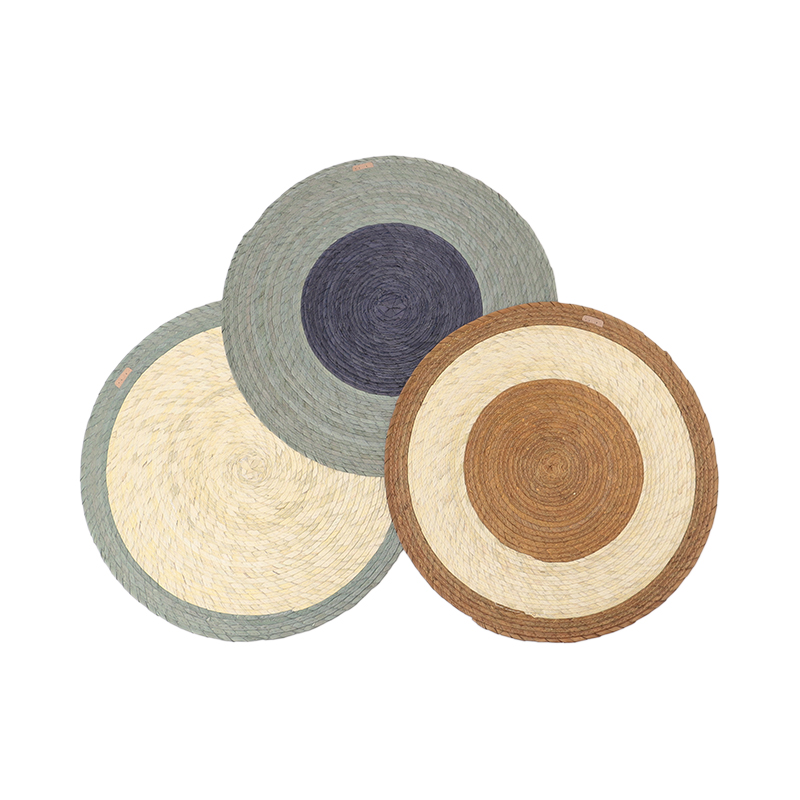 ヤシの木の葉を使用し、ハンドメイドで作られたプレイスマットは、ベースのナチュラルカラーにアプリコット、ブルー、セージ、レンガ色など、大地や植物、海などの大自然を思わせるカラーを組み合わせて作られました。