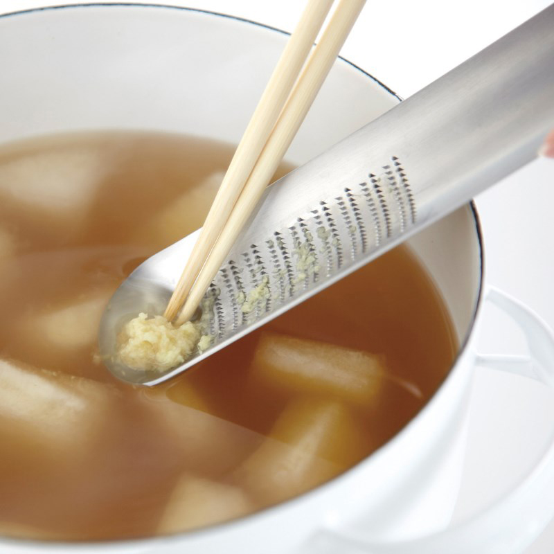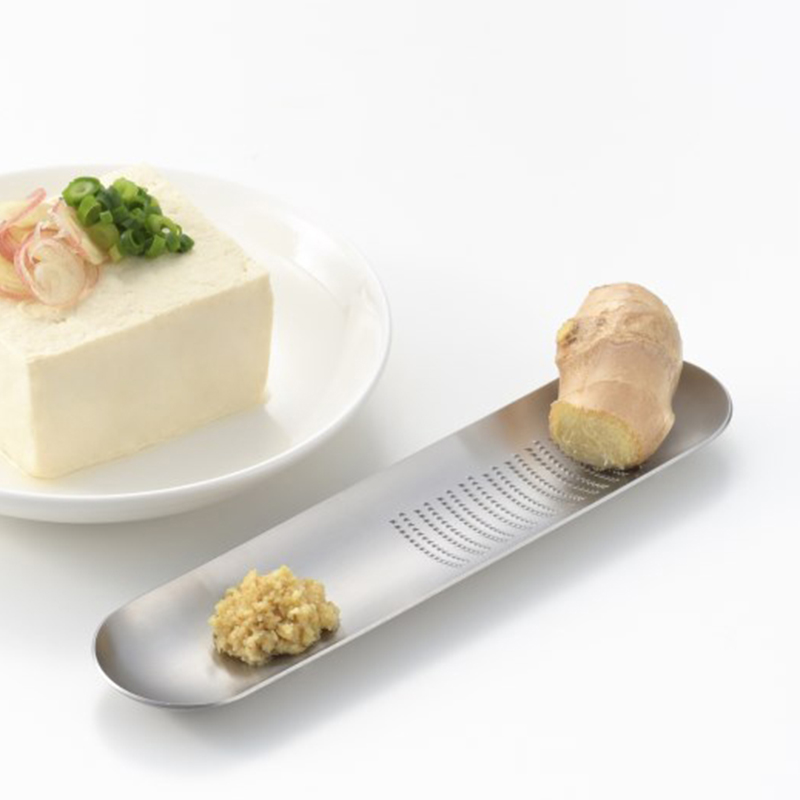 周囲にカーブをつけたトレー形状で、すって出た汁はこぼれにくく、お鍋の汁ものなどに薬味を溶かしながら入れられます。