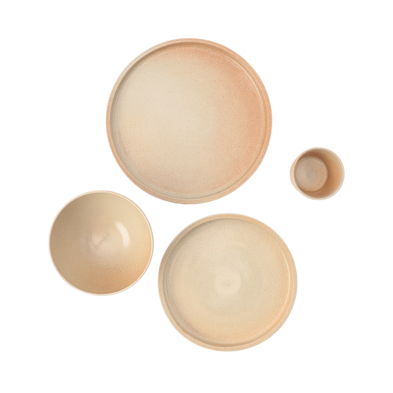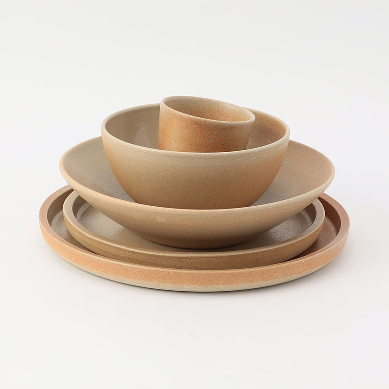材料には、ヒビや欠け等が出てしまった陶器を粉砕し粘土に混ぜ込み使用。また、釉薬には土・鉱物・自然原料のみを用い、酸素の量と焼き温度の変化のみで色合いを出しています。