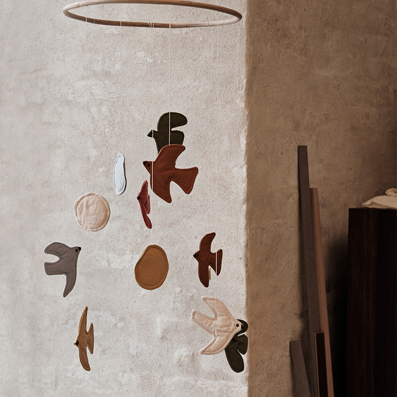 どこかフェミニンで温かみのあるカラーリング、シンプルで機能的なデザインの中に、北欧らしいユニークさが感じられ、デンマーク国内で高い人気を誇ります。また、環境に配慮した素材を厳選し、伝統的な職人技で作られたアイテムは、「使う人のため」を考えた真摯なものづくりを体現しています。オーガニックコットンで作られた鳥たちが優雅に飛び回る、遊び心と洗練された雰囲気が魅力のモビールです。