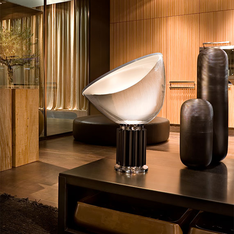 大胆で装飾的な土台の上についたディヒューザーは、凹面の反射鏡を備えており、大きな吹きガラスの中から反射光を放射します。