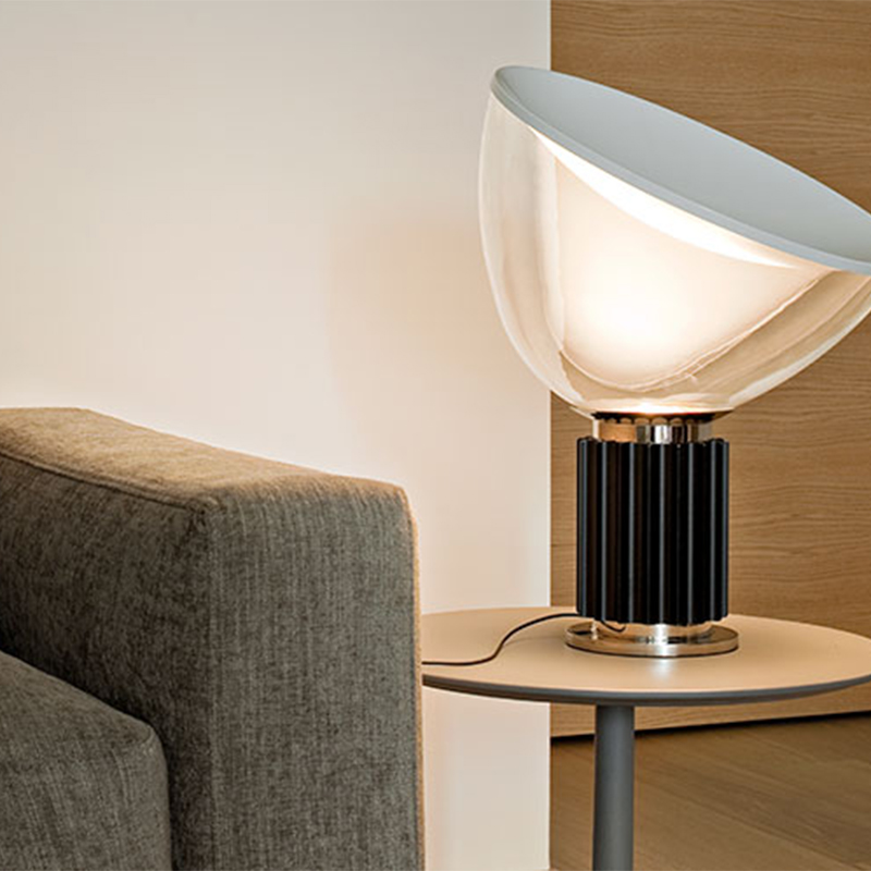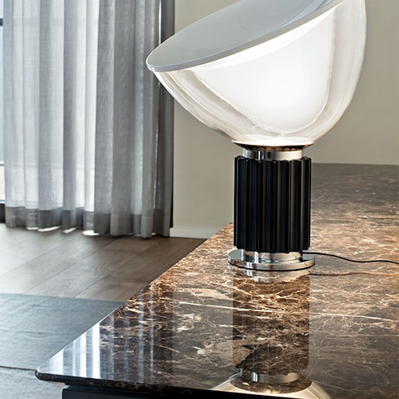 大胆で装飾的な土台の上についたディフューザーは、凹面の反射鏡を備えており、大きな吹きガラスの中から反射光を放射します。
