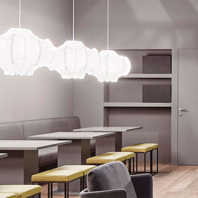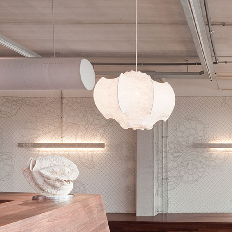 コクーンで形成されたVISCONTEA。見た目はまるで和紙のような素材で、穏やかな光が雲のようなデザインとあいまって、あたたかい雰囲気の空間を演出できます。
