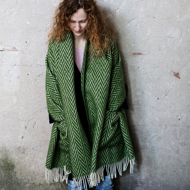 濃淡のある印象的な柄が目を引くIIDA(イイダ)ポケットショールは、他のポケットショールと比べて丈が長く、すっぽりと体を包みます。