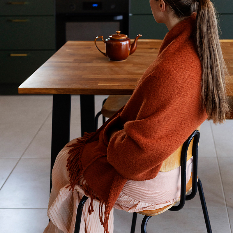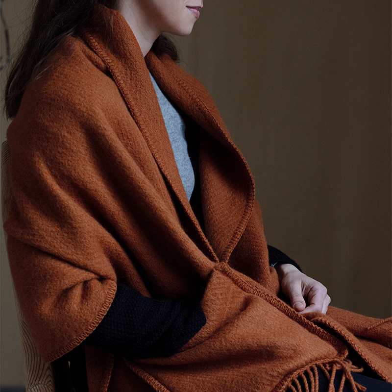 お家の中では、くつろぎの時間はもちろん、朝の起きがけや、テラスで過ごすひととき、またはデスクワーク中など、ふわりと羽織って寒さ対策に活躍します。