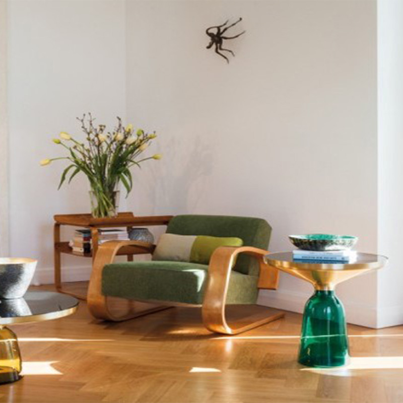 天板と真鍮製フレームが宙に浮かんでいるように見える、アート作品のようなサイドテーブルです。