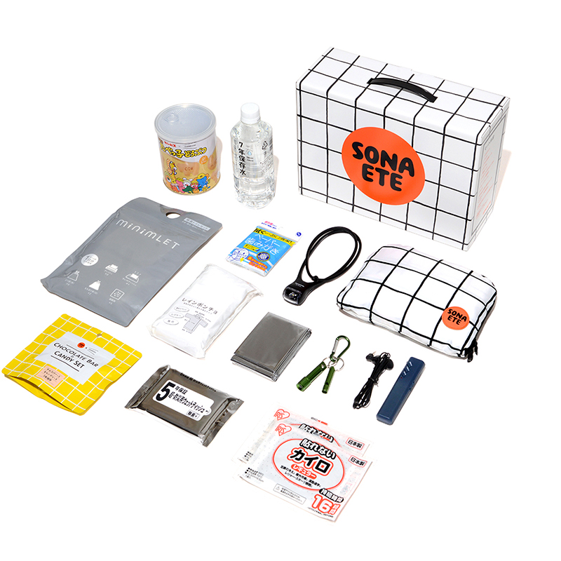 ・LEDネックライト・FMポケットラジオ・アルミ防寒シート・レインポンチョ・簡易トイレセット・LEDライト付きホイッスル・ペーパー歯みがき(5包)・ウェットティッシュ・カイロ(2枚)・イザメシ7年保存水 500ml・ギンビス×イザメシ厚焼きたべっ子どうぶつ・SONAETE オリジナルお菓子セット・SONAETE折り畳みリュック