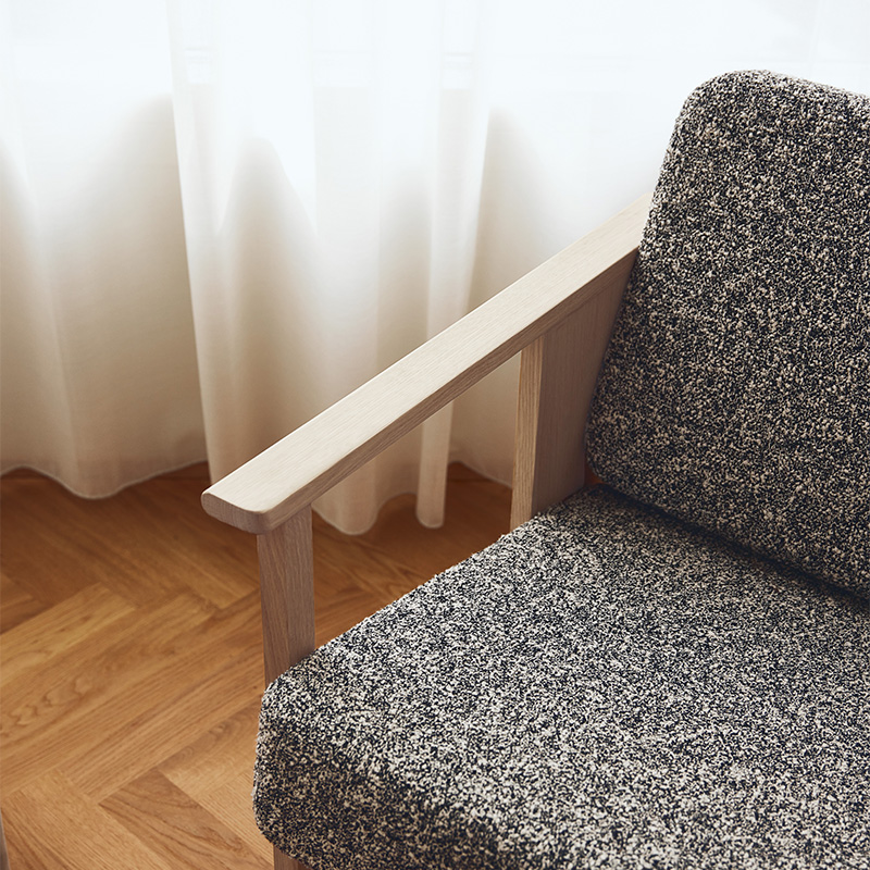 特徴的な木製パネルとゆったりとしたリネン キャンバスの布張りオーバーレイを備えたコンパクトなラウンジ チェア。耐久性のある純粋な原材料と人間工学に基づいた柔らかい形状が組み合わされています。このチェアは、最小限の設置面積にもかかわらず、十分な快適さを提供する多目的家具として設計されています。Zero テキスタイルは、エレガントで不規則なブークレの張り地です。