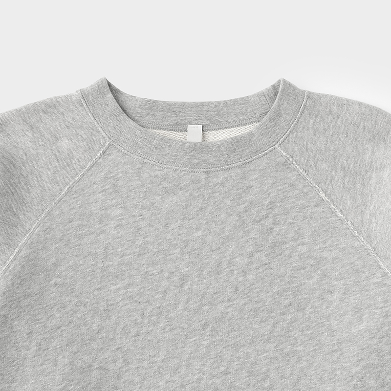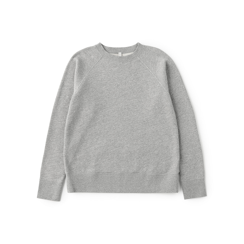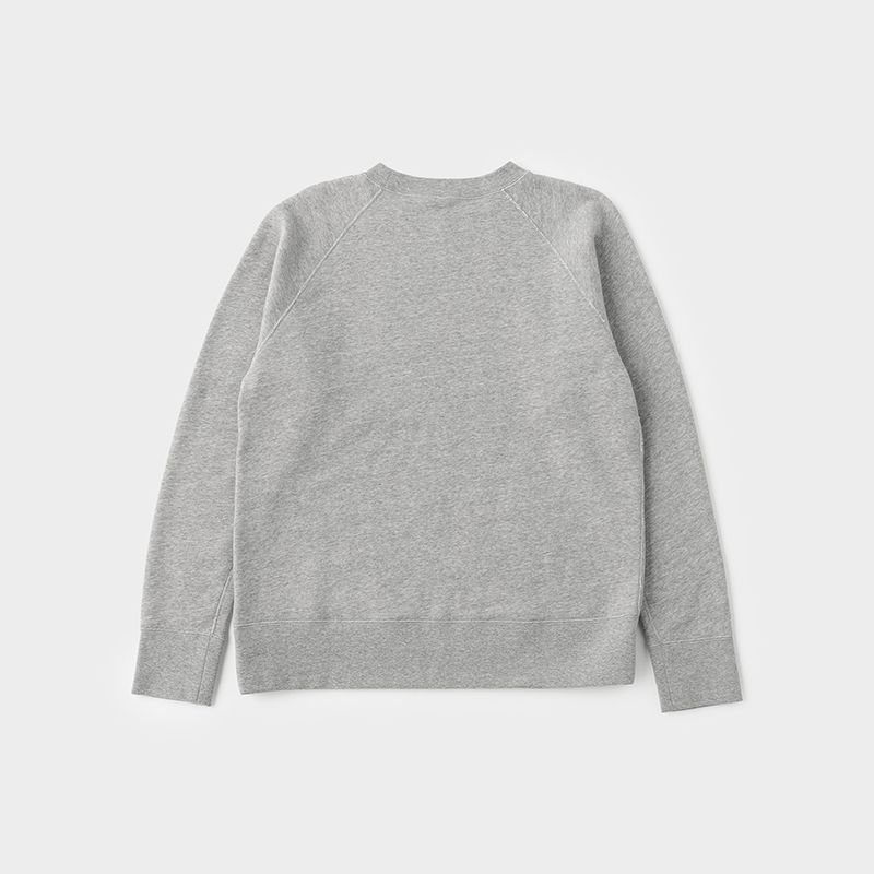 袖はラグラン仕様で、肩まわりの動きもスムーズ。ストレスなく着用できるのも特徴のひとつです。袖口と裾のフライスはやや長めに設定し、ヴィンテージスウェットを意識したデザインに仕上げています。シルエットはベーシックで、幅広いスタイルに合わせやすいプレーンな型です。(プルオーバー・フーディー・ダブルジップは同じサイズ感です。)