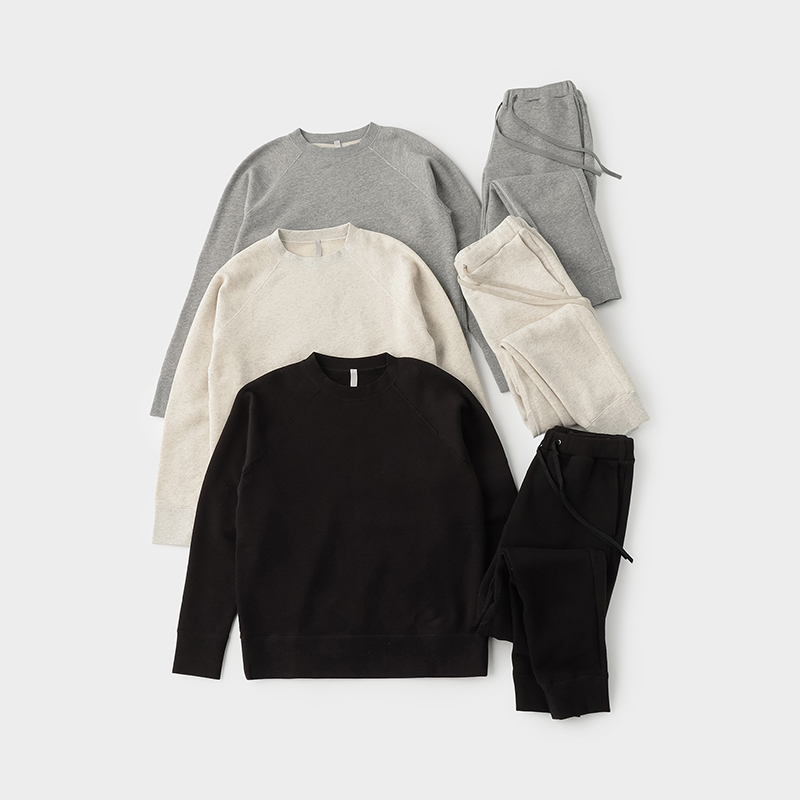 素材には、"kitt424"のベア裏毛を使用。縫製はフライス付け部分を除き、すべてフラットシーマで仕上げているため、裏面が肌に触れてもごろつきにくく、快適な着心地です。