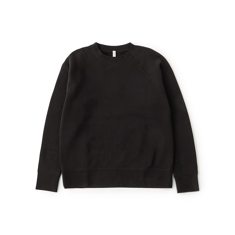 袖はラグラン仕様で、肩まわりの動きもスムーズ。ストレスなく着用できるのも特徴のひとつです。袖口と裾のフライスはやや長めに設定し、ヴィンテージスウェットを意識したデザインに仕上げています。シルエットはベーシックで、幅広いスタイルに合わせやすいプレーンな型です。(プルオーバー・フーディー・ダブルジップは同じサイズ感です。)
