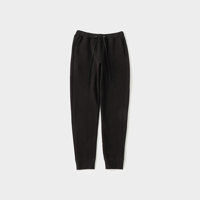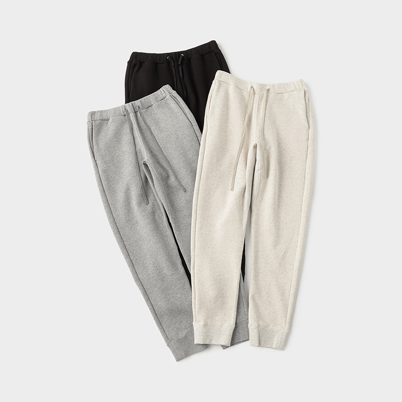 424ベア裏毛の特徴である、裏毛のやわらかな感触・ストレッチ性・軽量性をしっかりと感じられ、裾リブや股下のフライス使いが、古着のスポーツウェアのような雰囲気を演出します。