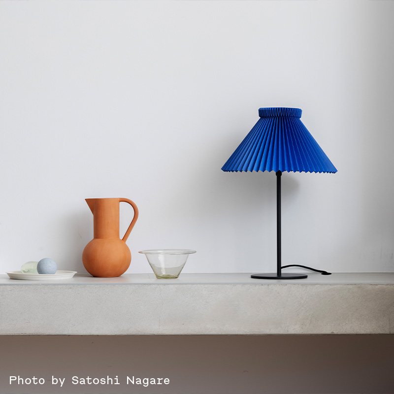 シェードカラーは、バターミルク、オイスターグレー、サファイアブルー、サクラ、スプリンググリーン、マゼンタ、ホワイトの全7色。サイズは、フロアランプが直径45cm、テーブルランプが直径33cmと、空間や用途に合わせてお選びいただけます。豊富なカラーとサイズ、そしてシンプルなブラックスタンドが生み出す軽やかな佇まいが魅力です。