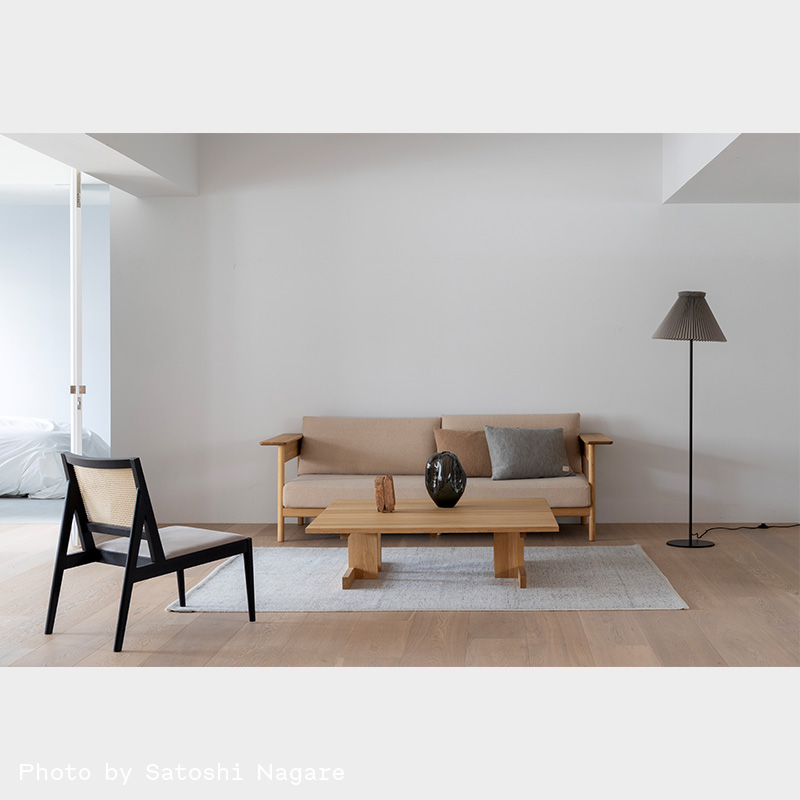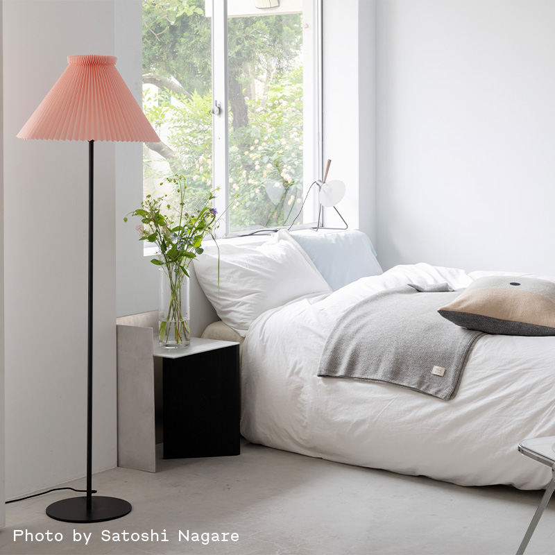 シェードカラーは、バターミルク、オイスターグレー、サファイアブルー、サクラ、スプリンググリーン、マゼンタ、ホワイトの全7色。サイズは、フロアランプが直径45cm、テーブルランプが直径33cmと、空間や用途に合わせてお選びいただけます。豊富なカラーとサイズ、そしてシンプルなブラックスタンドが生み出す軽やかな佇まいが魅力です。