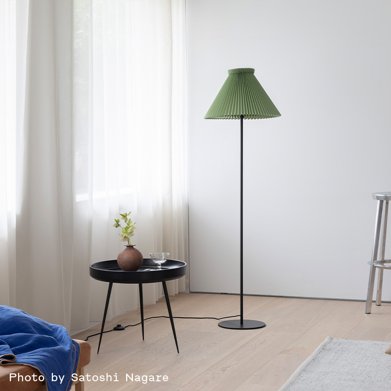 シェードカラーは、バターミルク、オイスターグレー、サファイアブルー、サクラ、スプリンググリーン、マゼンタ、ホワイトの全7色。サイズは、フロアランプが直径45cm、テーブルランプが直径33cmと、空間や用途に合わせてお選びいただけます。豊富なカラーとサイズ、そしてシンプルなブラックスタンドが生み出す軽やかな佇まいが魅力です。