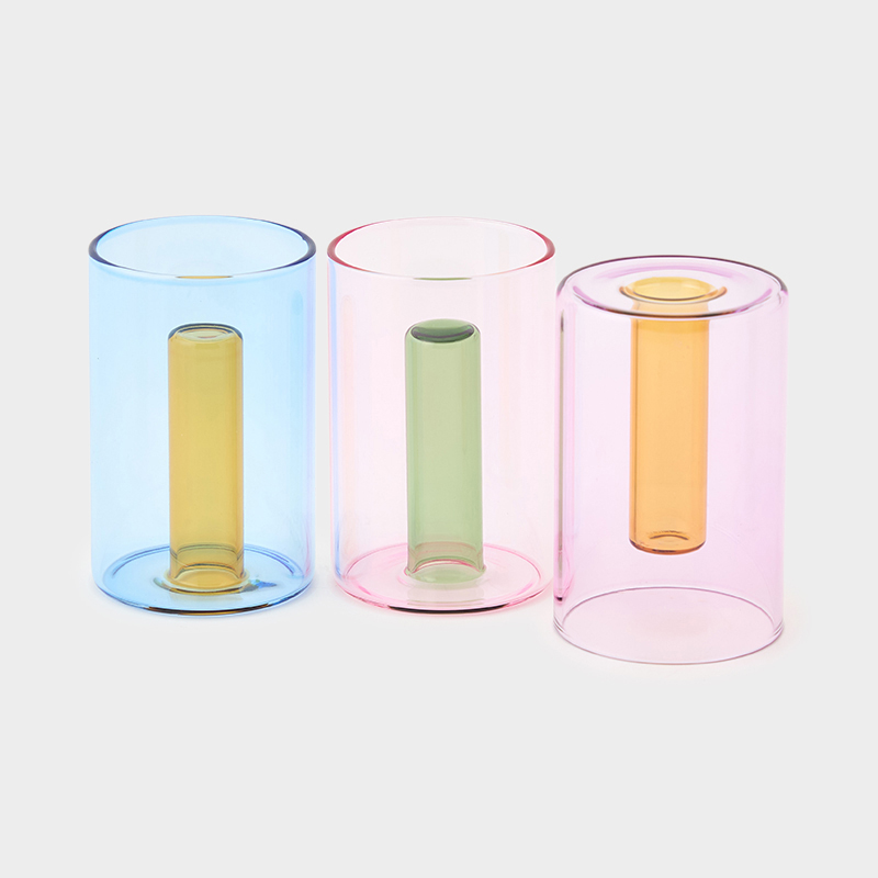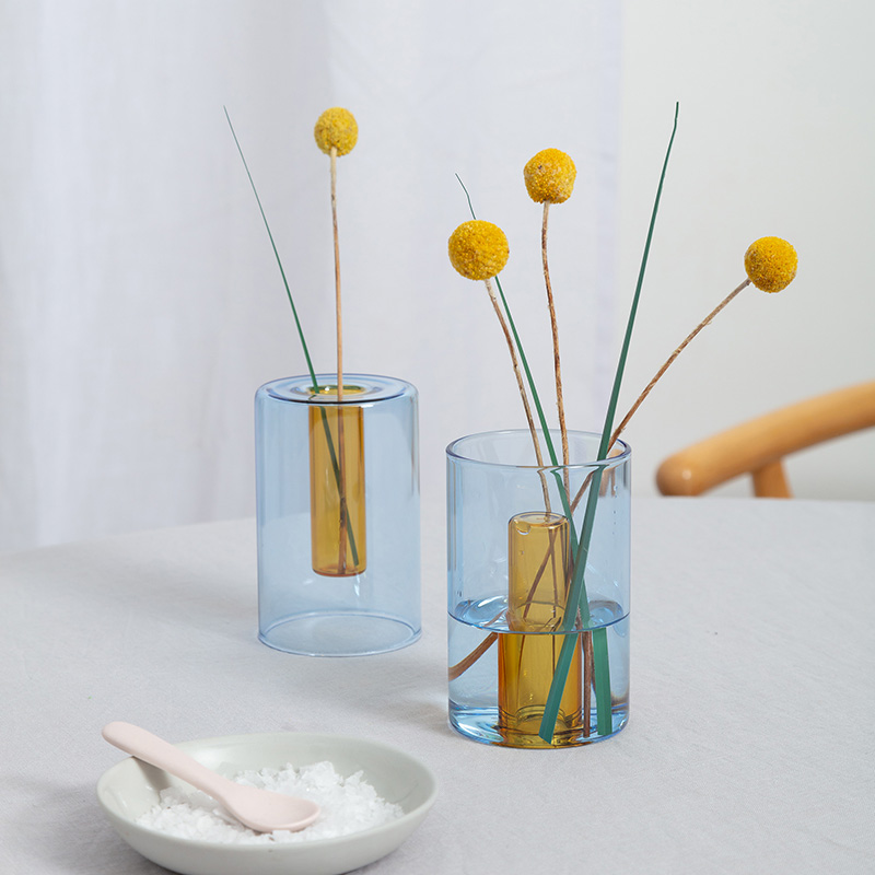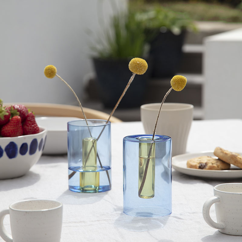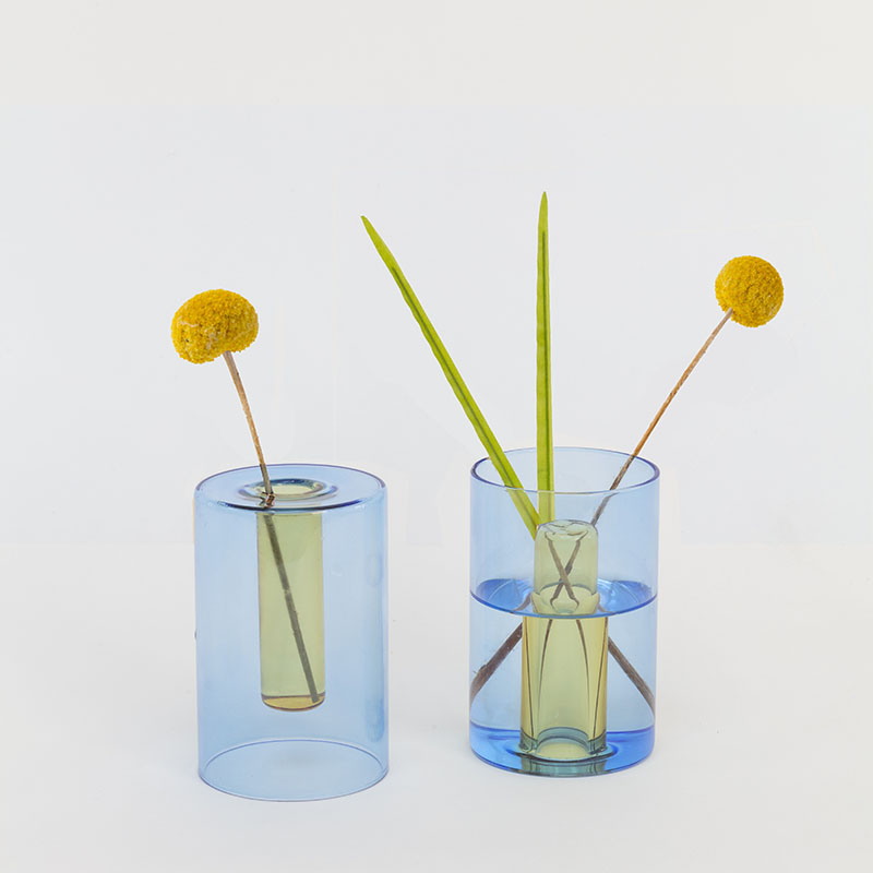 試験管のような細い口を上にすると一輪挿しとして、逆さにするとミニブーケを活けてお楽しみいただけます。